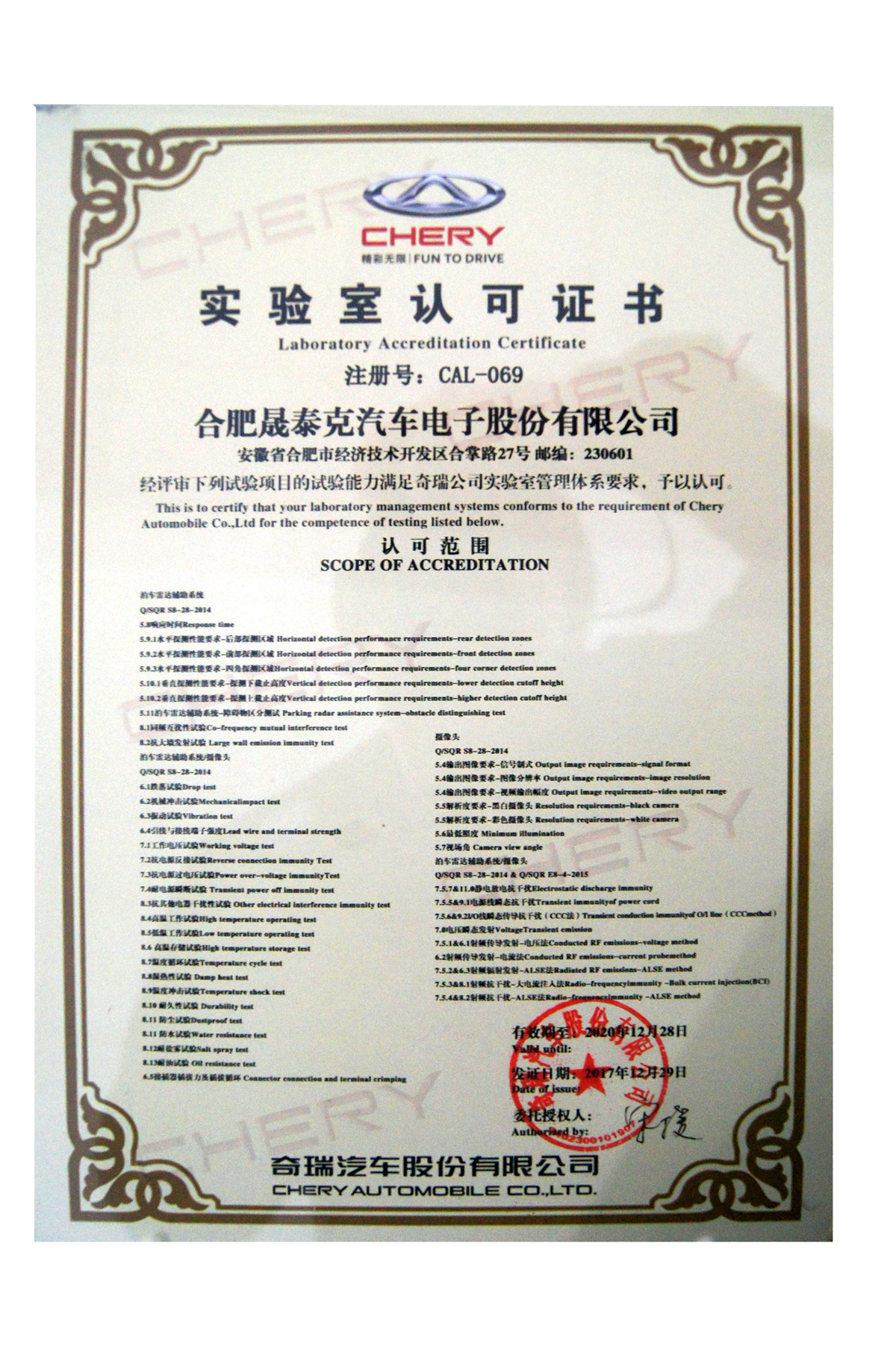 實驗室認可證書 奇瑞汽車股份有限公司