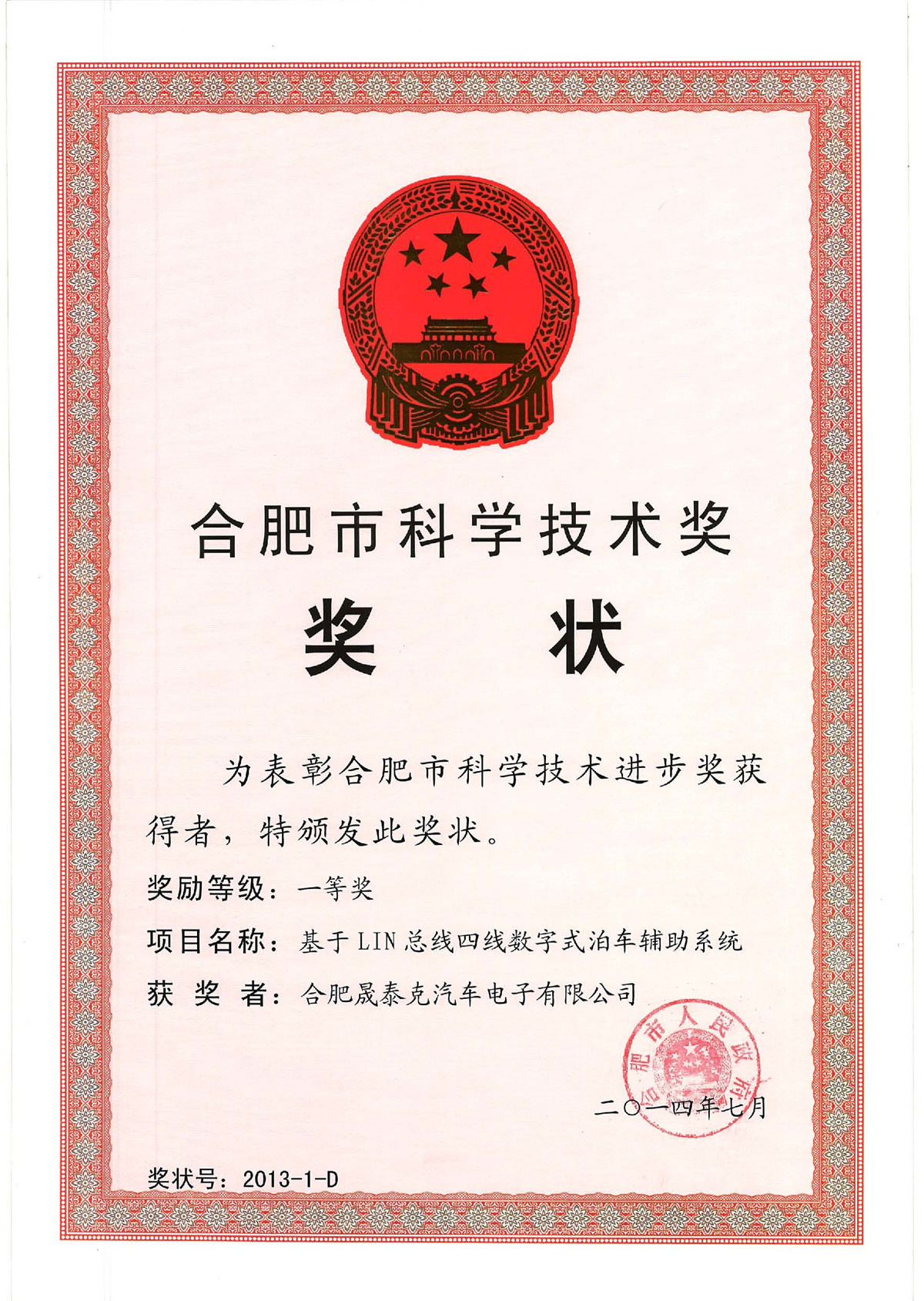 2014年7月合肥市科學技術(shù)獎一等獎(公司)