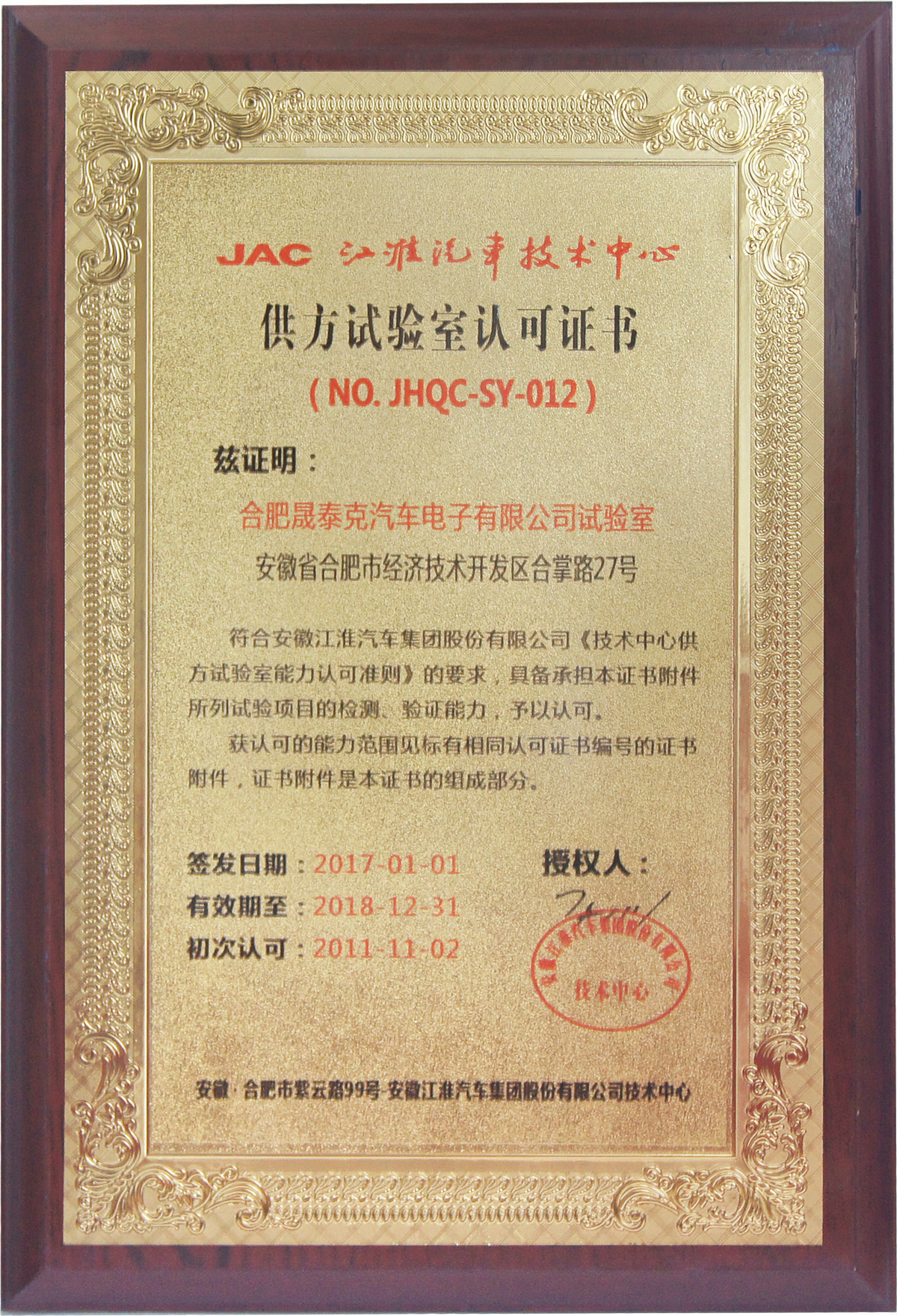 江淮汽車技術(shù)中心供方實(shí)驗(yàn)室認(rèn)可證書
